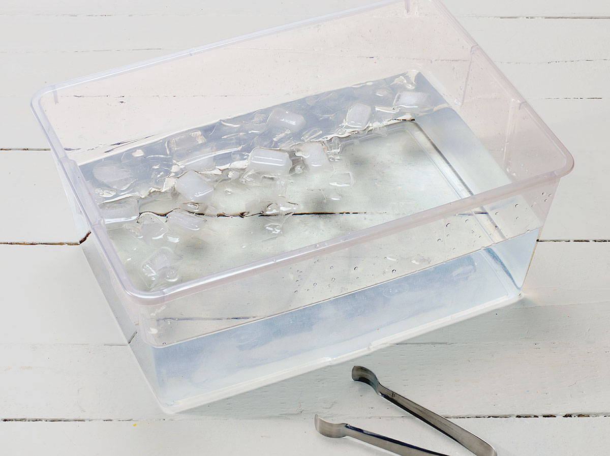 For this activity, you'll need a tub of water, a container full of ice cubes and tongs for handling the ice cubes.